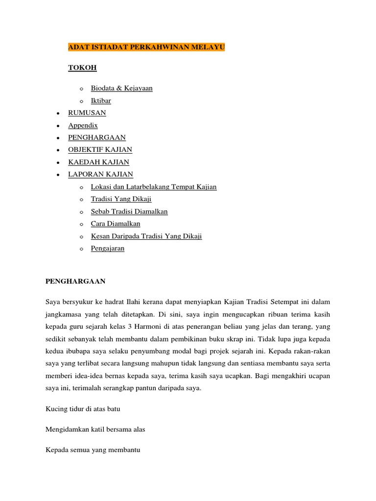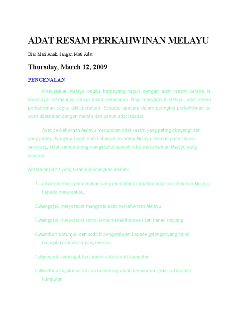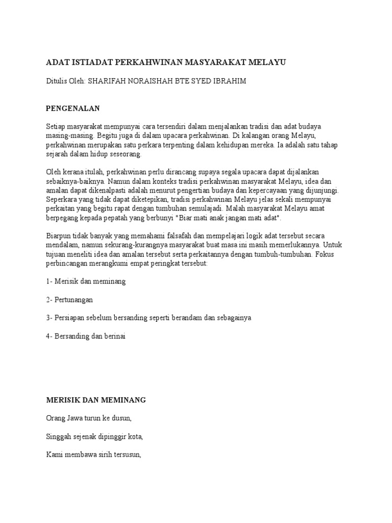 Dalam maysarakat melayu, kepentingan adat sangat diutamakan dalam kehidupan mereka.setiap perlakuan mereka akan dipengaruhi dengan adatnya yang tersendiri terutama dalam majlis perkahwinan masyarakat melayu. 2 me mera rasi si 2.3 melam melamar, ar, meminang meminang dan bertunangan bertunangan 3. In #introduceyourself • 3 years ago. Adat akan memainkan peranan dalam memastikan kelancran. Dalam adat perkahwinan masyarakat melayu, terdapat beberapa peringkat penting.