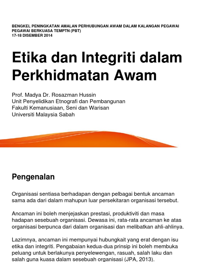1.2 kepentingan integriti nilai integriti dalam masyarakat kini semakin rapuh dan masalah ini kian berleluasa. Panel peperiksaan jabatan perkhidmatan awam bahagian iii; (b) perkhidmatan kehakiman dan perundangan; Bersempena dengan tahun baru 2016, pejabat suk kelantan telah menganjurkan program amanat khas tahun baharu 2016 & perhimpunan penjawat awam negeri kelantan. Kepentingan integriti dalam organisasi.1.mengurangkan gejala rasuah, penyelewengan dan salahgunakuasa secara berkesan.