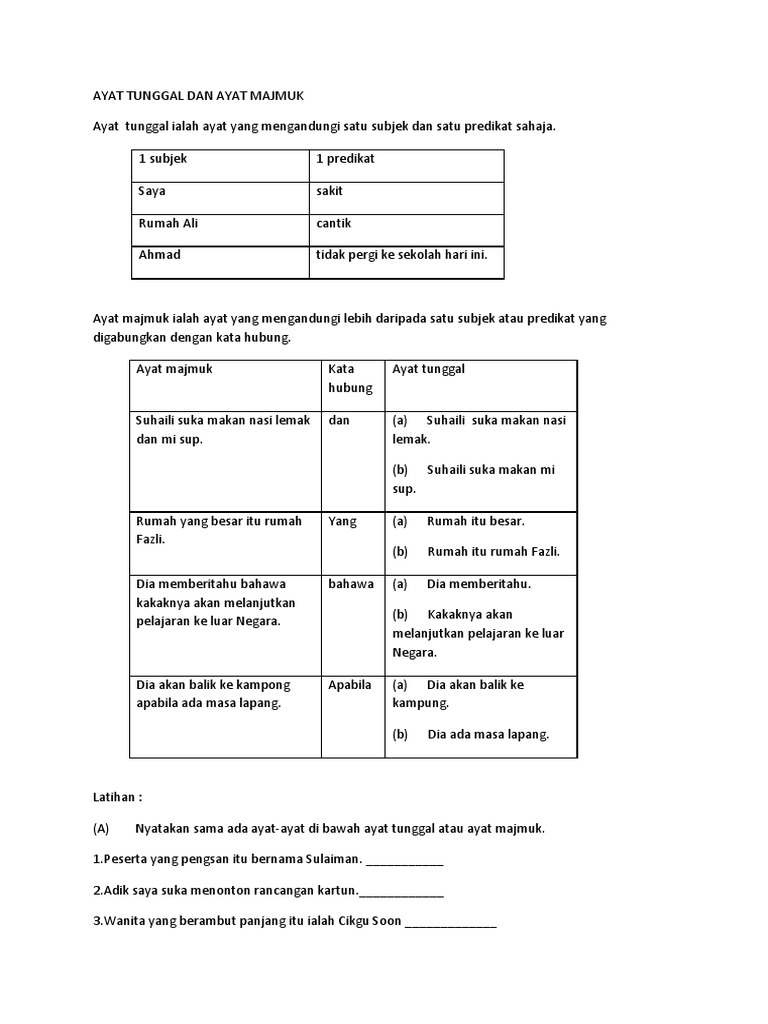 Ayat majmuk ialah ayat yang mengandungi lebih daripada satu subjek atau predikat yang. ( ayat tunggal ) b) razak membaca buku itu. Mengenal pasti ayat tunggal dan ayat majmuk Ayat tunggal dan ayat majmuk ayat tunggal ialah ayat yang mengandungi satu subjek dan satu predikat sahaja. Ayat tunggalsubjekpredikatpuan zilaseorang penjual kerepek pisang.menyediakan sambal ikan bilis.ayah ainaaisyahsedang mengayuh basikal.terdiri daripada dua atau lebih ayat tunggal (ada.